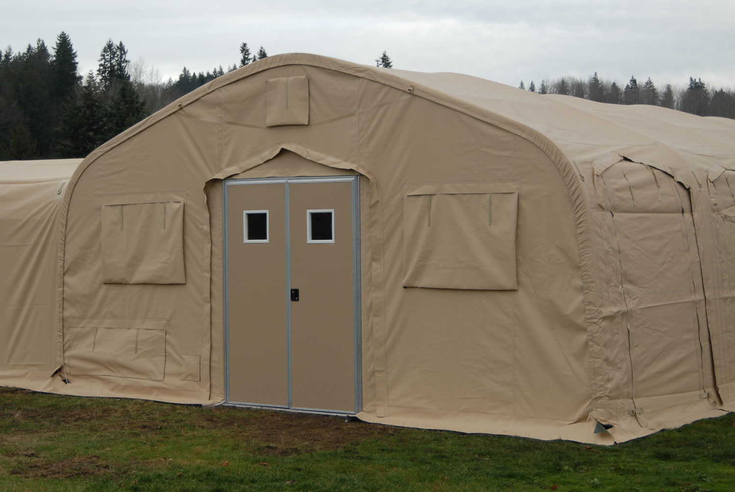 Connecting to the end of a 20EX Shelter System the 20EX Medical Extension allows the complexing of multiple shelters together. The extension is one additional 8′ shelter bay that allows another 20EX Shelter System to be attached in-line with existing shelter to create a continuous unobstructed space. The extension also allows for additional shelters to be connected to the sides of existing shelter through the use of side boot connectors. As it is the medical extension these boot connectors are meant to attach to a medical vestibule which allows for a wider and taller walkway between shelters.